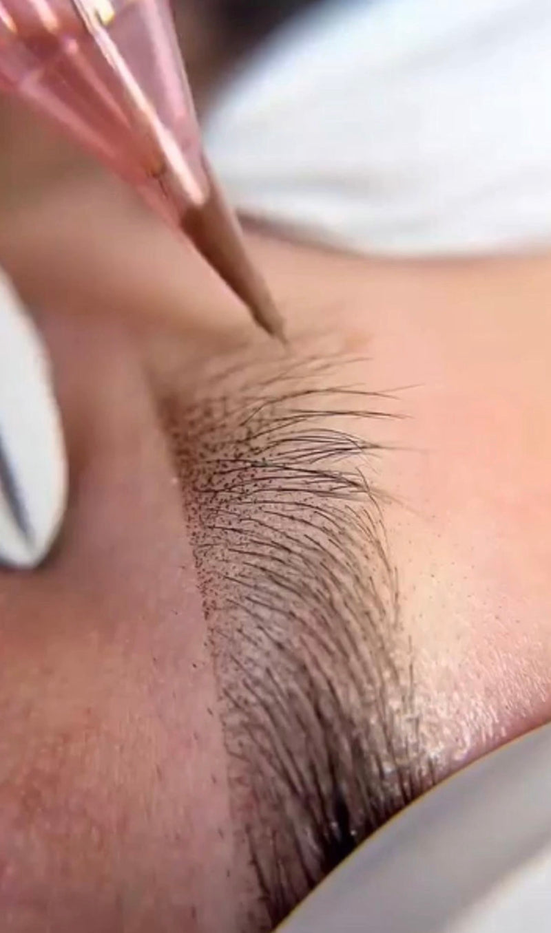 Hybrid tint is a long-lasting tint that combines traditional dye with henna-like pigments to create a fuller, more defined brow. It stains both the brow hairs and the skin, helping to fill in sparse areas, enhance shape, and create a structured, makeup-like finish that lasts longer than regular tint.